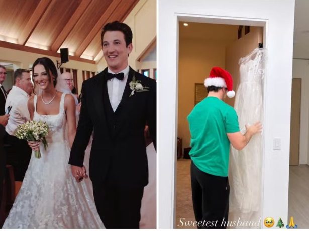 O ator Miles Teller, conhecido por seus papéis em “Whiplash: Em Busca da Perfeição” e “Top Gun: Maverick”, presenteou a esposa, a modelo e atriz Keleigh Teller, com uma surpresa tocante neste Natal. O artista providenciou a recriação do vestido de noiva da amada, que havia sido destruído em um incêndio que atingiu a região de Los Angeles em janeiro deste ano.